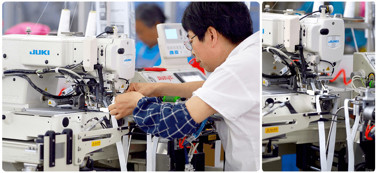刘潭服装采用的高速全自动切缝橡筋带机,特有的装置可对橡筋毛头切割处理,可操作控制所需橡筋的长度和数量,结束缝制后会自动停止工作,适用于多种规格橡筋拼接工艺,线迹平整美观。全程自动化操作,设备实现了自动送料、自动剪切、自动拼接,自动收料等步骤。机器在连续循环缝制过程中高速运转,进而大幅提升生产效率、降低成本,达成改造智能工厂的目的。