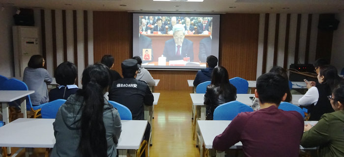 2017年10月18日,全党和全国各族人民热切盼望的中国共产党第十九次全国代表大会在北京隆重开幕。上午九点,刘潭服装各级党员和团员利用会议室多媒体收看了此次开幕式盛况,而服装加工一线员工中午则通过食堂电视观看了十九大直播。