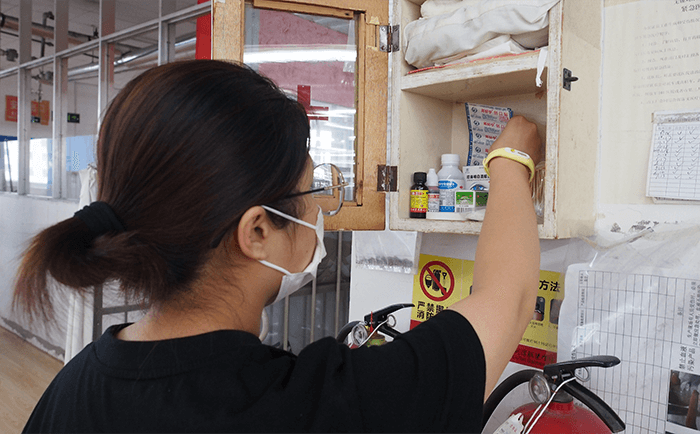 刘潭服装厂为了进一步做好安全应急工作,公司每个生产车间配备了安全药箱。药箱里配有碘酊、红药水、眼药水、创可贴、纱布、棉球、包扎带、清凉膏等11件急救用品。确保一有事件发生就可以立即进行应急处理。药箱内的急救用品会定时进行补充,保障员工的人身安全。