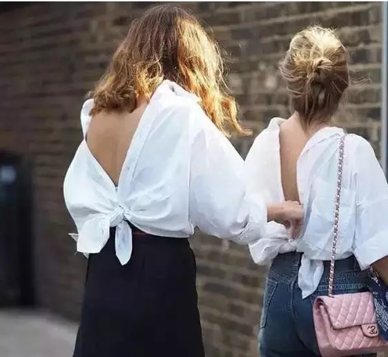 这种反穿是在衬衫最下端系扣子,衬衫上部扣子全部解开,露出美美的背;